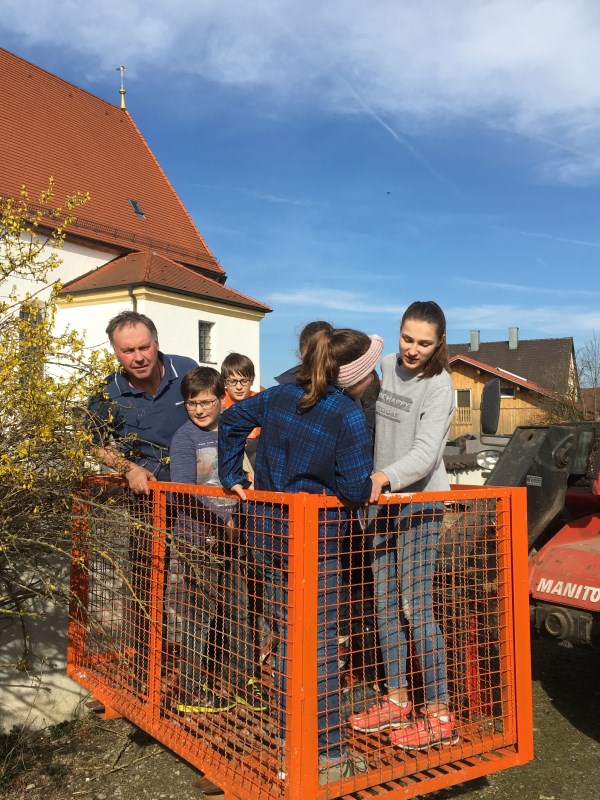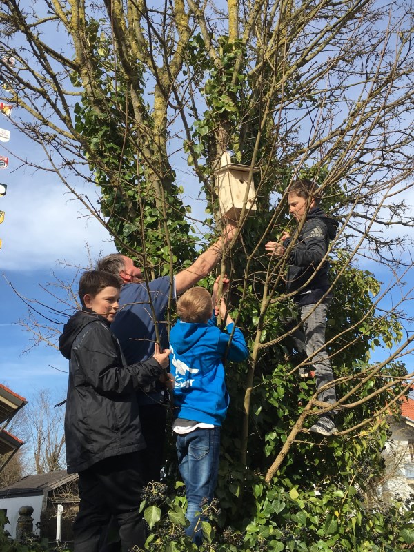 Gespannt hörten unsere Minis zu, als er die unterschiedlichen Nistkästen für die jeweilige Vogelart erklärte. Mit Bohrmaschine, Schrauben und Nägel bewaffnet machten sich die Ministranten mit Herrn Frauendienst auf den Weg und suchten geeignete Plätze zum Aufhängen der Kästen.