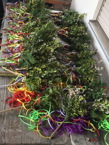 Am Palmsonntag wird an den Einzug Jesu in Jerusalem erinnert.Die Gläubigen treffen sich häufig zuerst vor der Kirche zur Segnung der Palmbuschen.