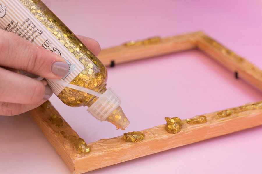 2. Wenn die Farbe noch feucht ist, kann man den Bilderrahmen  zusätzlich mit goldenem Glitzer verzieren.