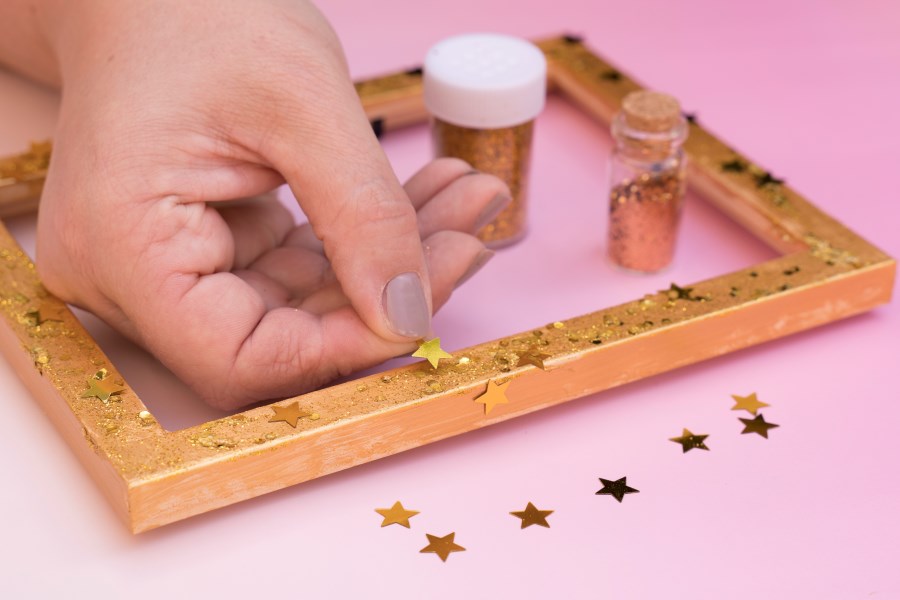 3. Wenn die Farbe noch feucht ist, können die Kinder zusätzlich goldenen Glitzer oder goldene Sterne auf den Bilderrahmen streuen.